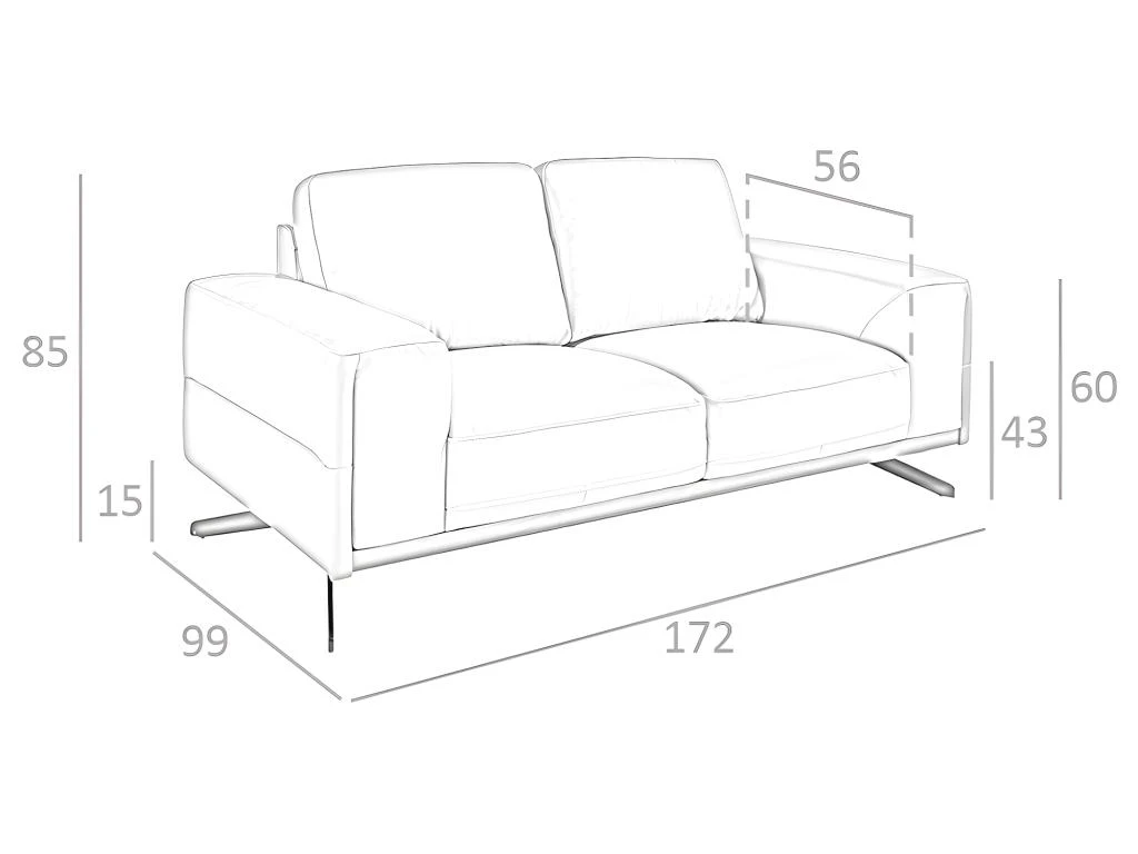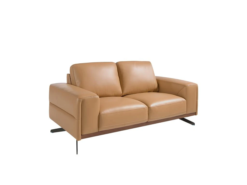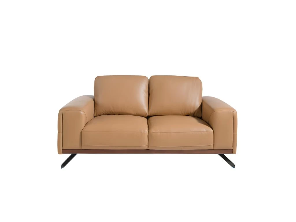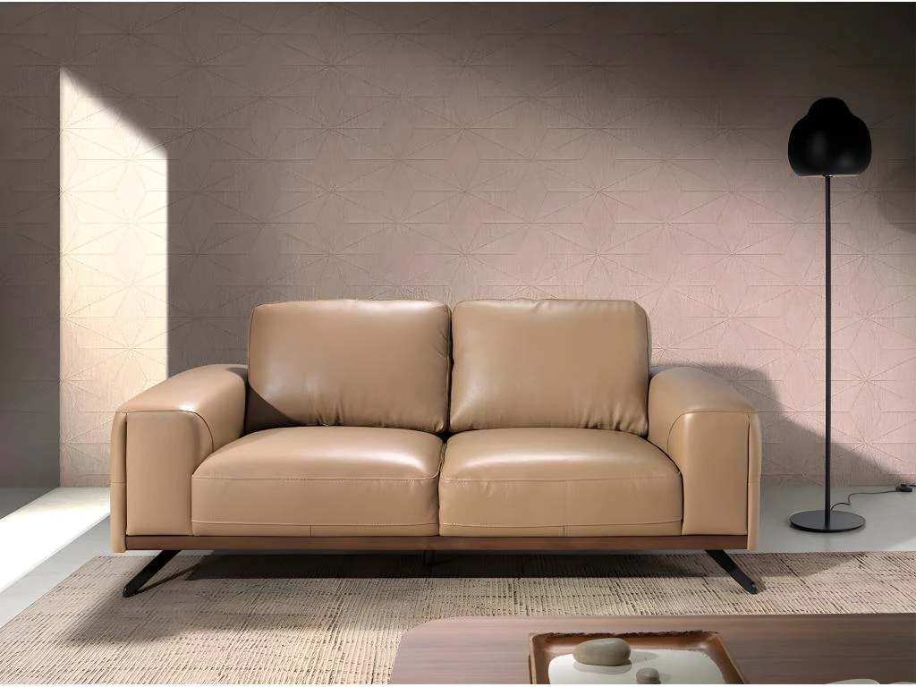 Canapé 2 places de design moderne tapissé en cuir d’origine bovine de 1,25 mm d’épaisseur couleur Arena. Structure de la base en chêne teinté noyer et pieds en acier inoxydable noir. Un canapé de style avant-gardiste et moderne, avec une structure interne robuste en bois de pin naturel et un rembourrage en mousse de polyuréthane d’une densité de 20 kg/m3, vous offre le confort supplémentaire et la commodité que vous recherchez pour votre repos. La combinaison parfaite de design, d’élégance et de confort