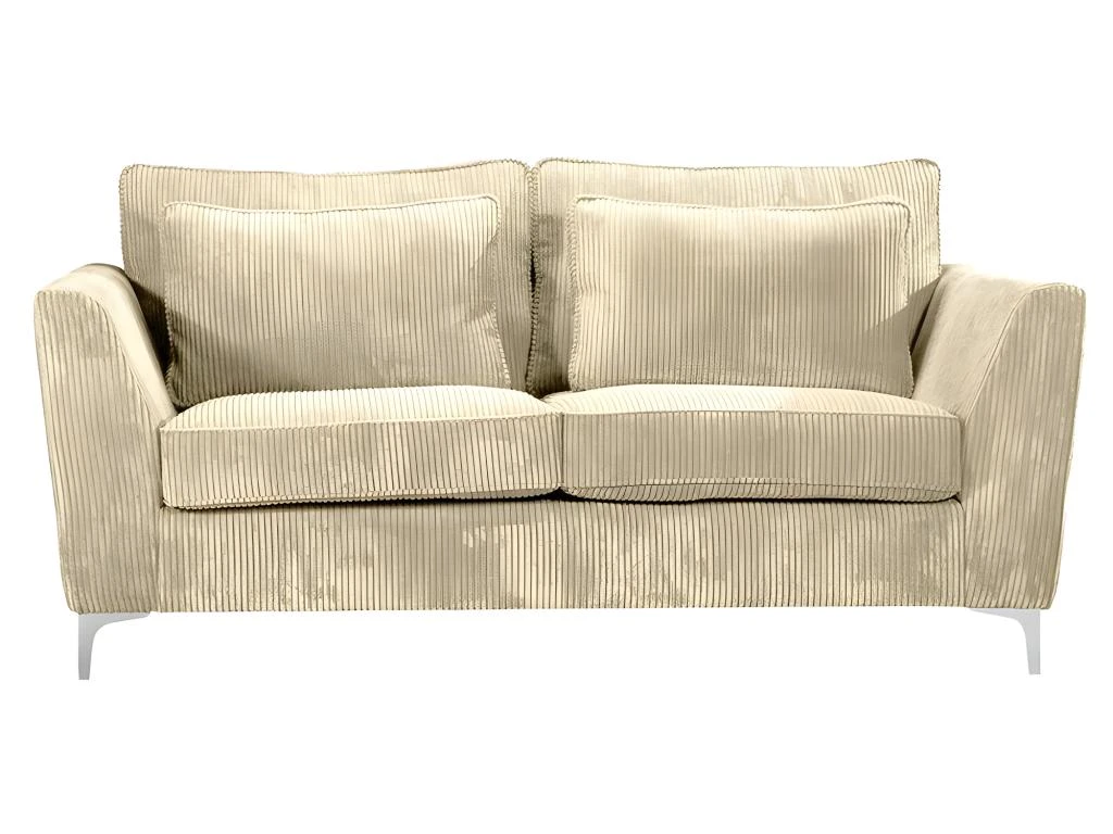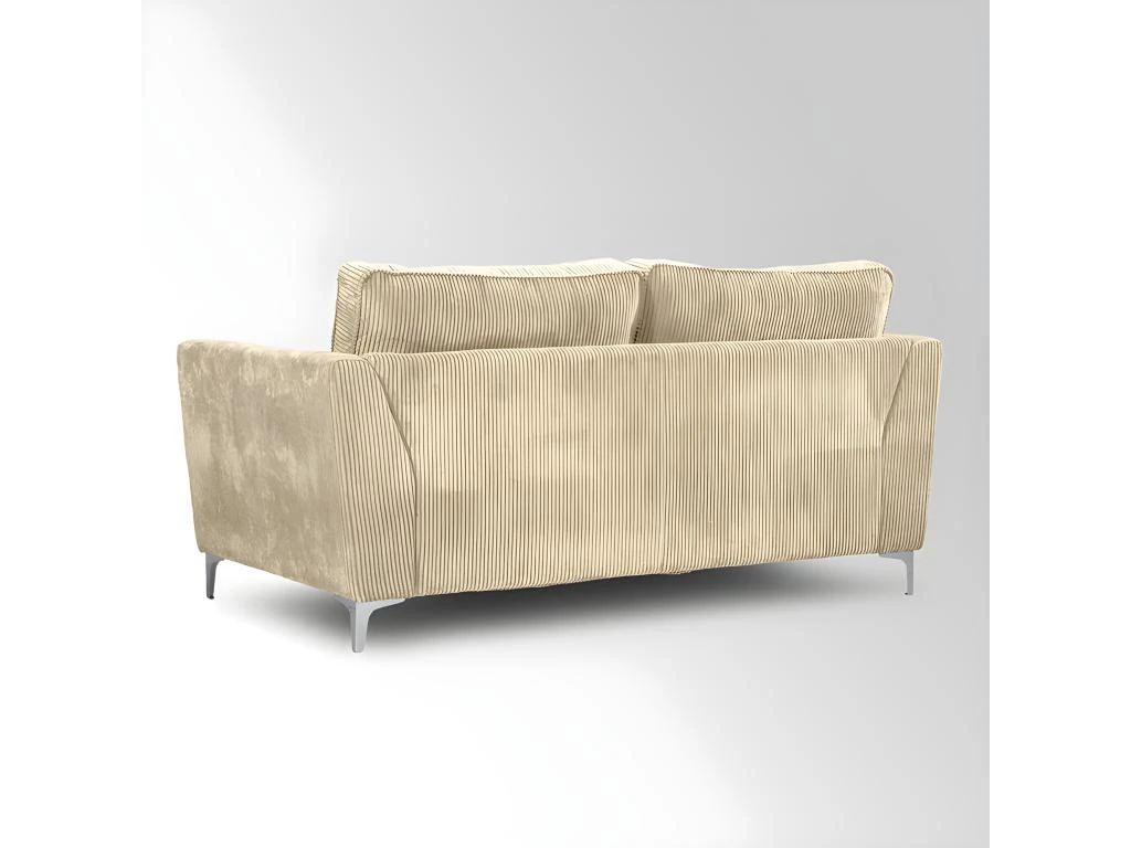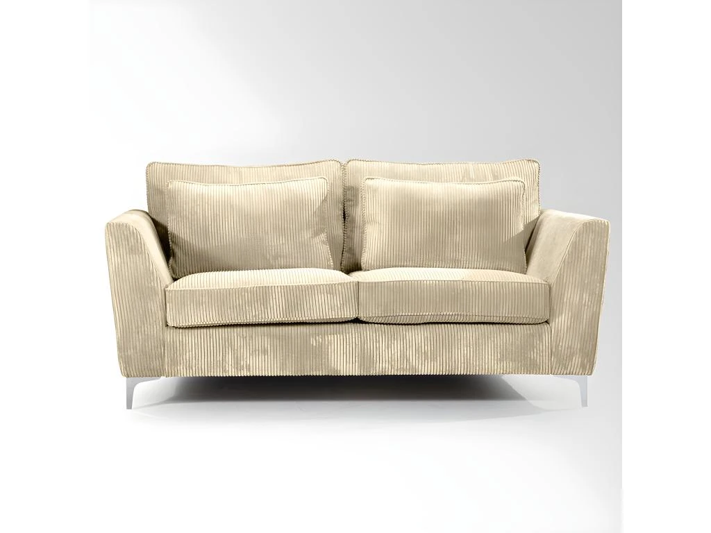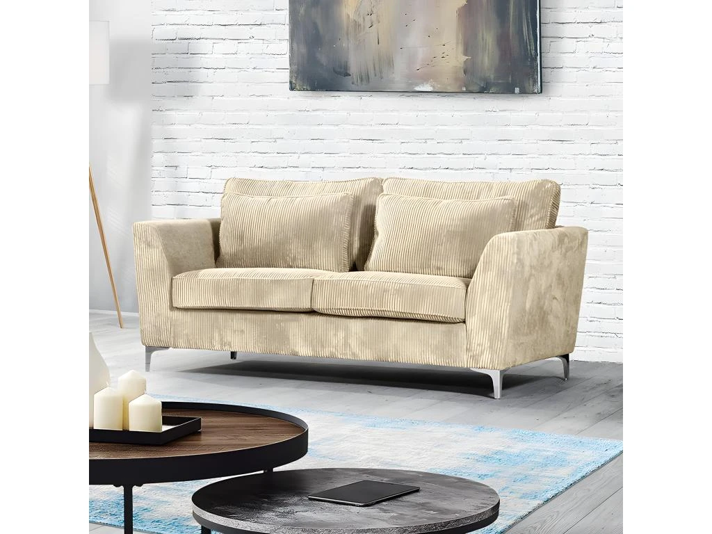 Canapé ISLA Ses points forts : grandes dimensions et grand confort. Canapé fixe 2 places. Mousse haute densité 30 kg/m3. Tissu en velours cà´telé épais 380 g/m ², 100 % polyester, coloris beige. Structure en bois massif (pin) et fibres de bois (MDF). Assise : mousse PU haute densité 30 kg/m3 (12 cm) sur sangles élastiques. Dossier : 2 grands coussins + 2 coussins plus petits, déhoussables garnis de fibres de silicone. Pieds métal à monter soi-même. Dimensions 183×96 cm, hauteur 93 cm. Poids 55 kg.