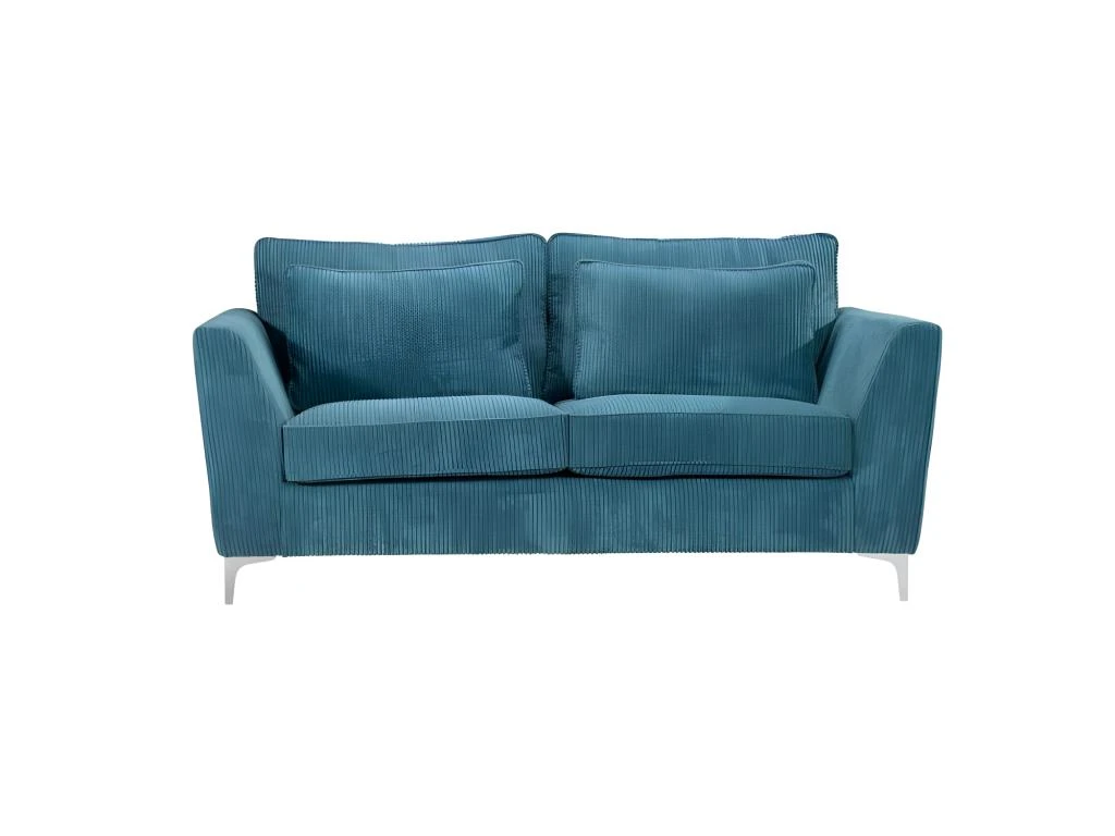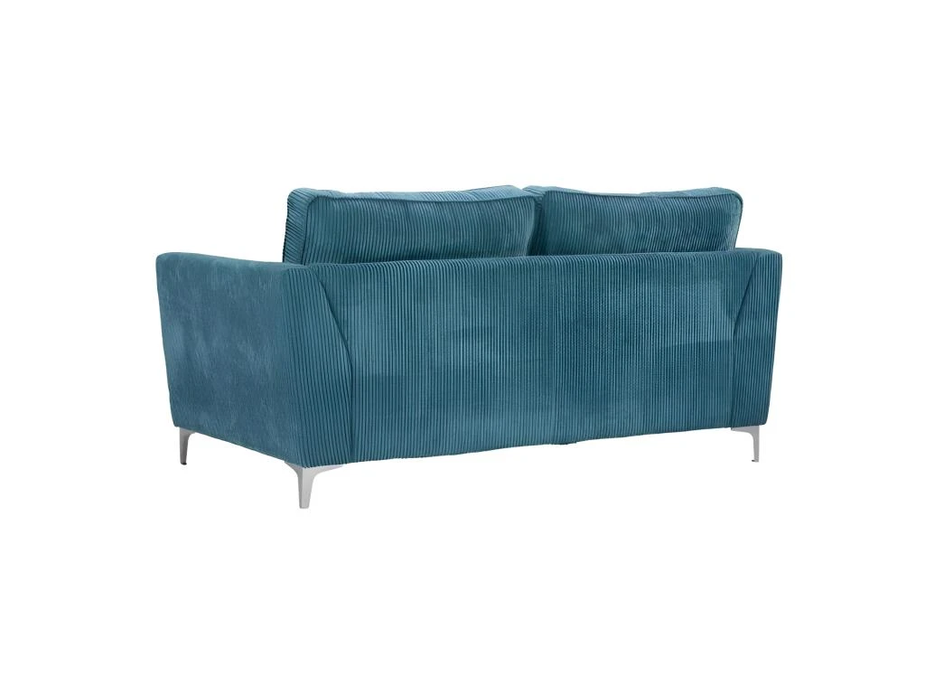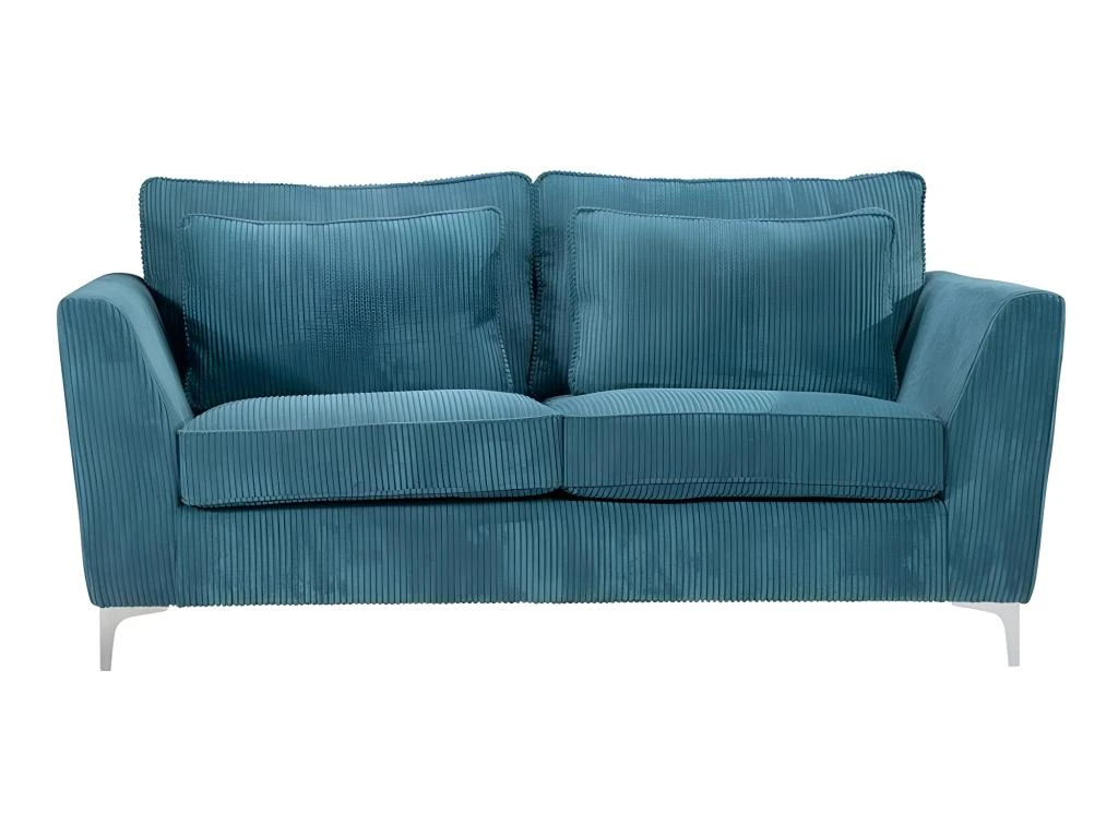 Canapé ISLA. Ses points forts : grandes dimensions et grand confort. Canapé fixe 2 places. Mousse haute densité 30 kg/m3. Tissu en velours côtelé épais 380 g/m ², 100 % polyester, coloris bleu. Structure en bois massif (pin) et fibres de bois (MDF). Assise : mousse PU haute densité 30 kg/m3 (12 cm) sur sangles élastiques. Dossier : 2 grands coussins + 2 coussins plus petits, déhoussables garnis de fibres de silicone. Pieds métal à monter soi-même. Dimensions 183×96 cm, hauteur 93 cm. Poids 55 kg.