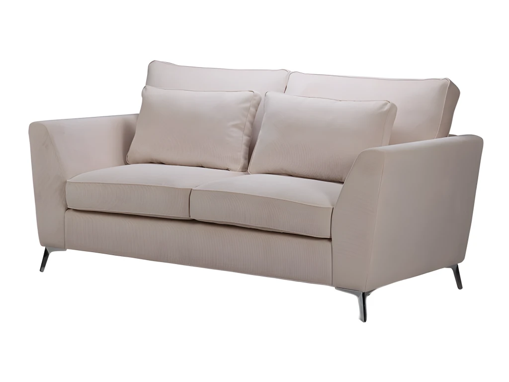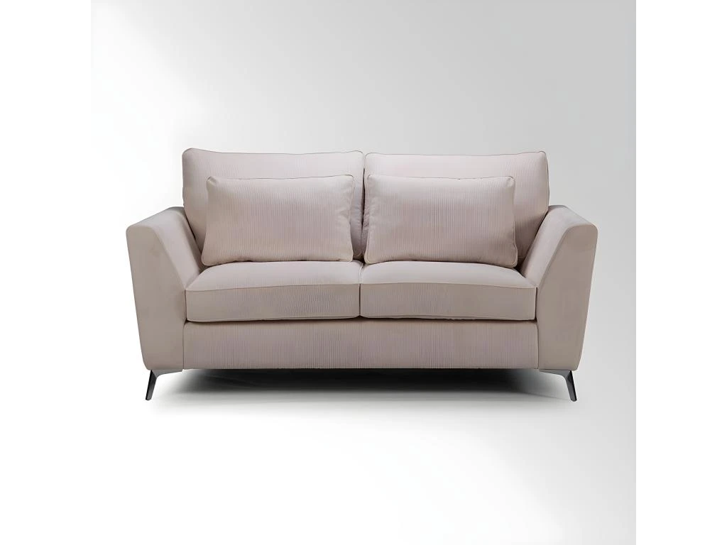 Canapé Isla en velours côtelé beige. Ses points forts : grandes dimensions et grand confort. Canapé fixe 2 places. Mousse haute densité 30 kg/m3. Tissu en velours côtelé très doux au toucher. Structure en bois massif (pin) et fibres de bois (MDF). Assise : mousse PU haute densité 30 kg/m3 (12 cm) sur sangles élastiques. Dossier : 2 grands coussins + 2 coussins plus petits, déhoussables garnis de fibres de silicone. Pieds métal à monter soi-même. Dimensions 183×96 cm, hauteur 93 cm. Poids 55 kg. Fabrication européenne.