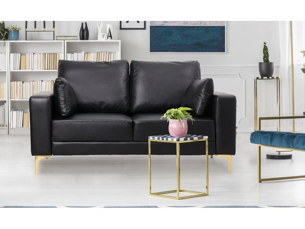 N’hésitez plus et adoptez vite ce canapé deux places au meilleur prix, en l agrémentant d un petit pouf et d une table basse dorée !