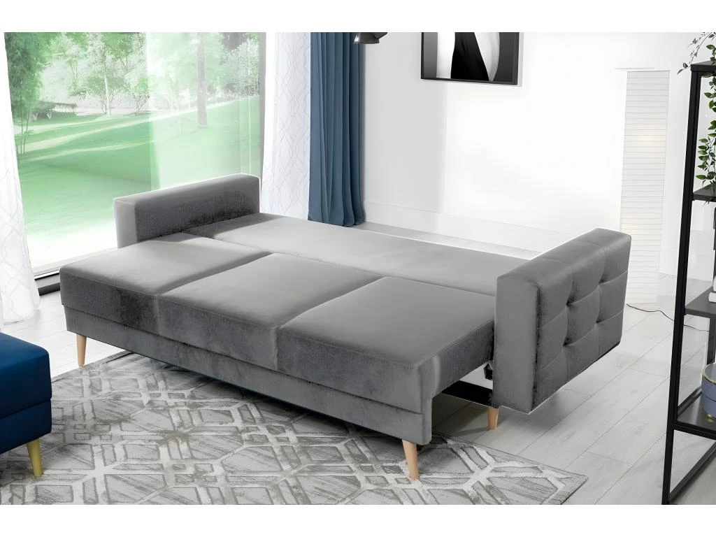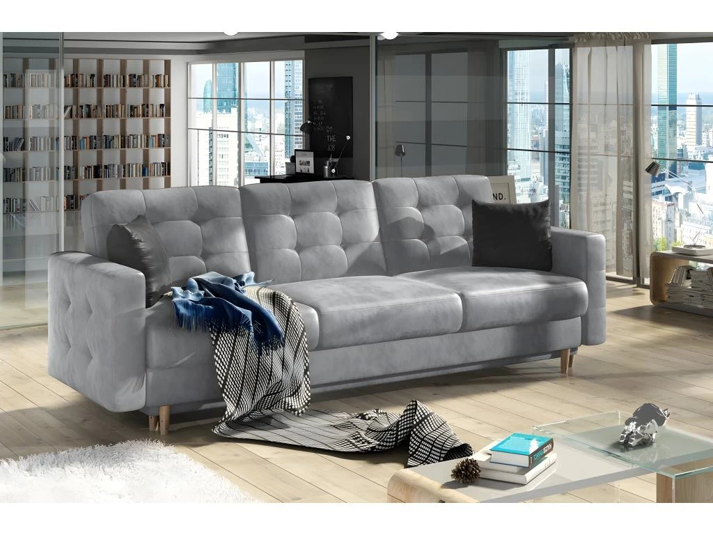 Très joli canapé 3 places en tissu de luxe, convertible – ASVENA. Ce très beau canapé répond aux plus exigeants qui recherchent à la fois des fonctionnalités pratiques et un grand confort. Grâce à son large espace de couchage à ouverture facile. Tissu de grande qualité et agréable au quotidien. Tissu velours très doux et de la catégorie luxe. Assise très confortable grâce à son excellent rembourrage. Très bonne qualité de fabrication. Fabrication européenne. Tissu de la catégorie la plus élevée.
