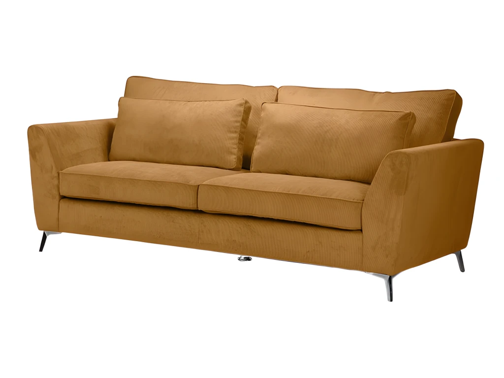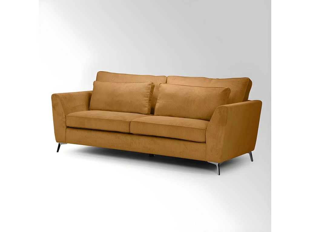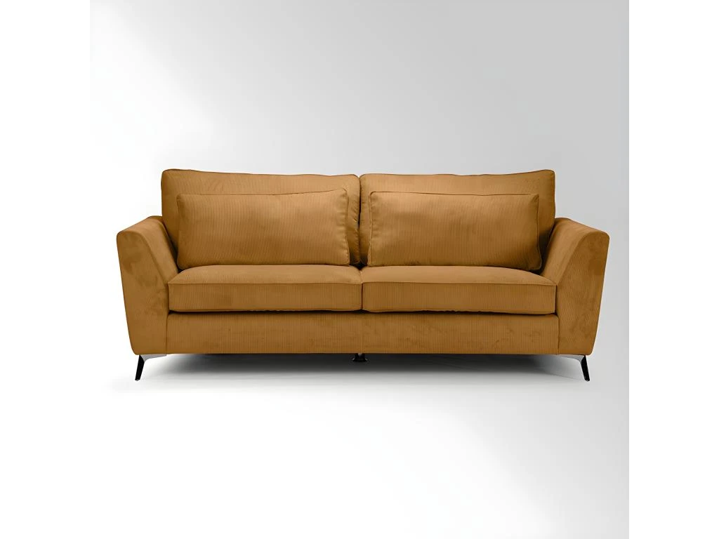 Canapé ISLA Ses points forts : grandes dimensions et grand confort. Canapé fixe 3 places. Mousse haute densité 30 kg/m3. Tissu en velours côtelé, 100 % polyester, coloris ocre. Structure en bois massif (pin) et fibres de bois (MDF). Assise : mousse PU haute densité 30 kg/m3 (12 cm) sur sangles élastiques. Dossier : 2 coussins (65×38 cm) et 2 coussins (80×48 cm) déhoussables garnis de fibres de silicone. Pieds métal à monter soi-même. Dimensions 223×96 cm, hauteur 93 cm. Poids 64 kg. Fabrication européenne.