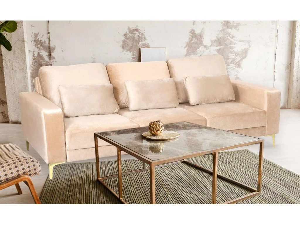 N’hésitez plus et adoptez vite ce canapé trois places au meilleur prix, en l agrémentant d un petit pouf et d une table basse dorée !