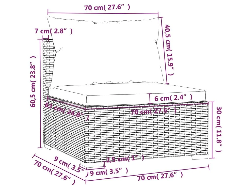 - Dimensions de chaque canapé central : 70 x 70 x 60,5 cm (L x l x H)