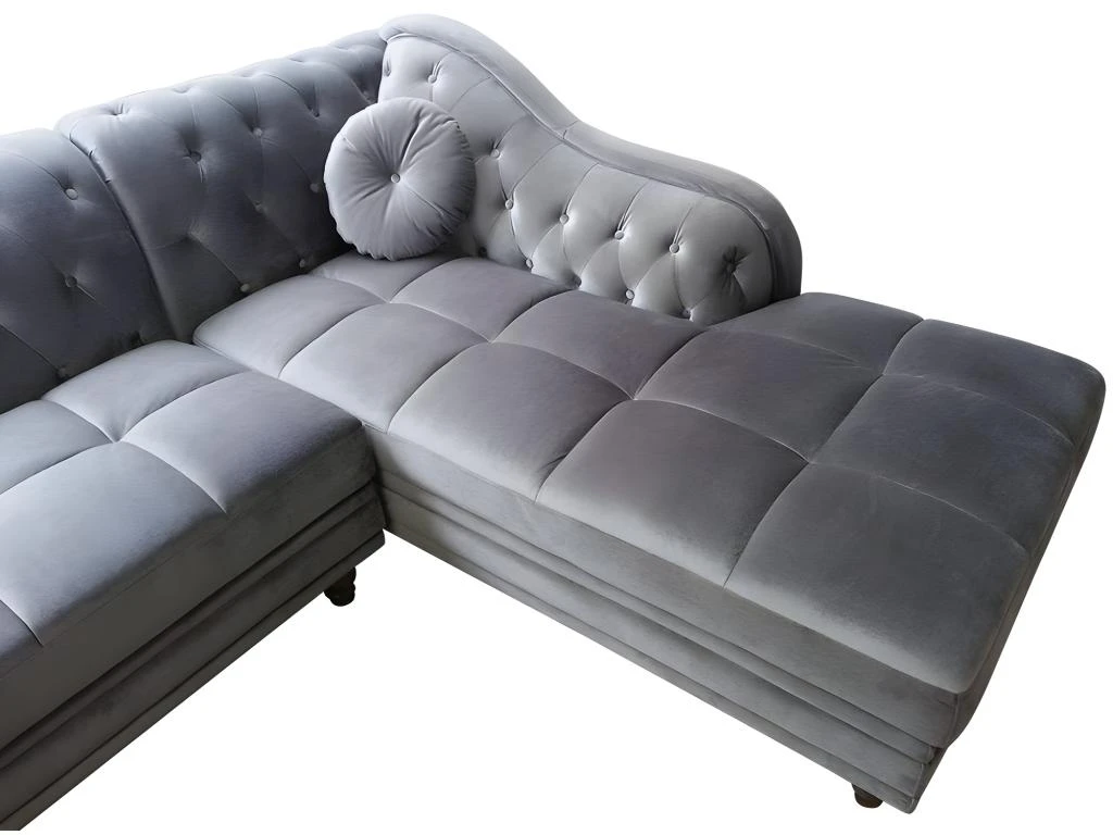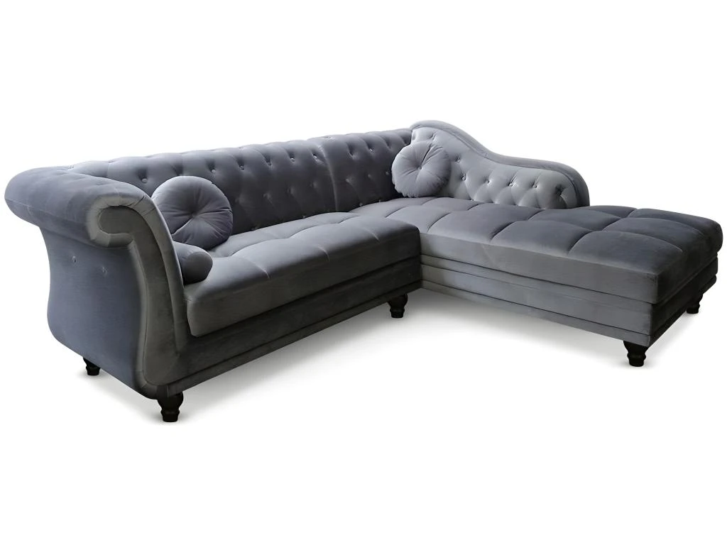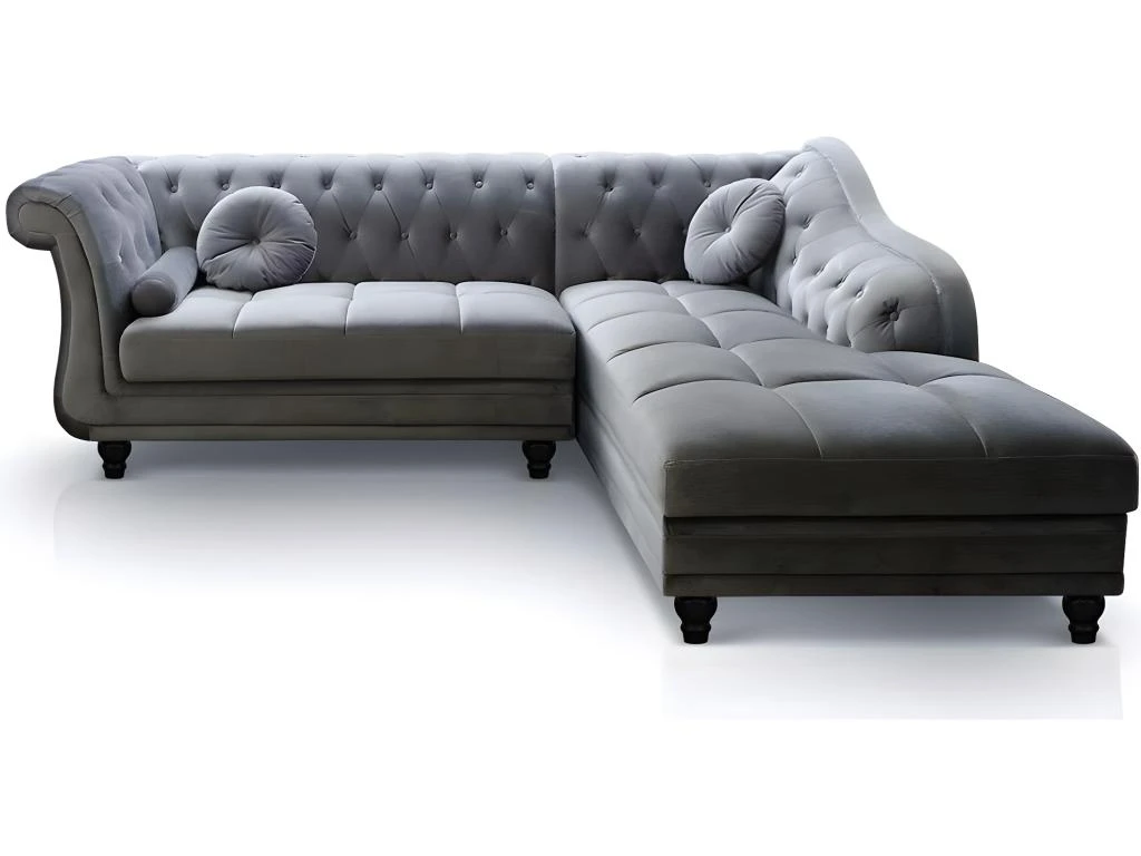Simple mais élégant, le canapé d’angle Brittish plait à coup sûr à ceux qui recherchent un meuble sobre et chic pour sublimer leur pièce à vivre. Ce modèle vous offre un confort inégalé, par ses larges dimensions et son revêtement en velours d’une grande douceur. Les petits coussins et le traversin qui l’ornent, ainsi que son capitonnage bien réalisé, viennent améliorer votre confort tout en apportant une touche d’élégance supplémentaire à votre intérieur. Ce canapé d’angle d’une dimension totale de 240 cm s’adresse à tous ceux qui sont en quête d’un produit de qualité alliant confort et esthétisme. Il est doté d’une méridienne pour vous permettre de vous y étendre en lisant un bon livre ou, pourquoi pas, faire une sieste. Sa structure réalisée à partir de matériaux de première qualité souligne sa robustesse, tout en assurant une utilisation optimale pendant de longues années. Le revêtement en velours vient accentuer ce côté robuste, tout en ajoutant une note harmonieuse à votre pièce à vivre. Utilisez ce canapé d’angle de style chesterfield pour apporter un style britannique à votre intérieur. Intemporel et indémodable, il s’harmonisera sans peine à la décoration générale de votre intérieur, qu’elle soit plutôt classique ou résolument moderne. Vous avez le choix entre la couleur argent, noir ou taupe. Grâce à ses pieds d’une hauteur de 10 cm, ce canapé laisse assez d’espace pour vous permettre de nettoyer aisément le dessous du canapé. Votre intérieur sera ainsi toujours propre ! Ces pieds ouvragés rehaussent également le côté chic et raffiné de l’ensemble.Catégories Associées :Canapé 5 places, Canapé gris, Canapés veloursCatégories Associées :Canapé angle gris