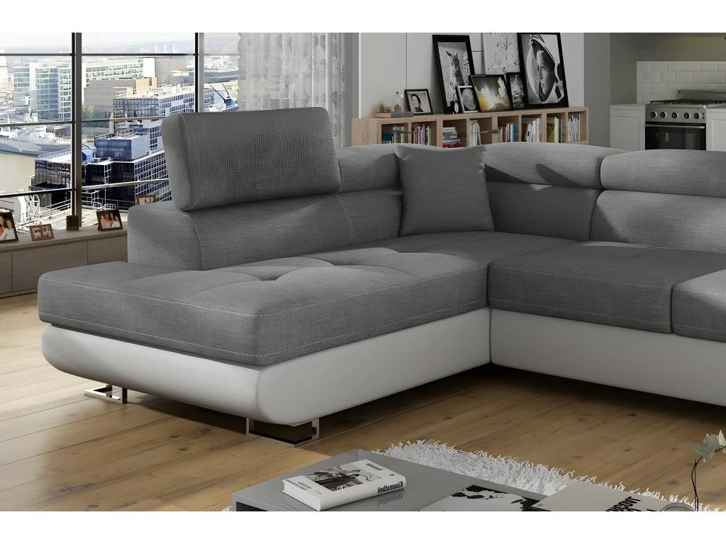 Canapé D’angle Convertible En Tissu Luxe Et Simili Cuir 5 Places, Coffre, Gris / Blanc Cassé, Angle Gauche (vu De Face), ANNECY MIX