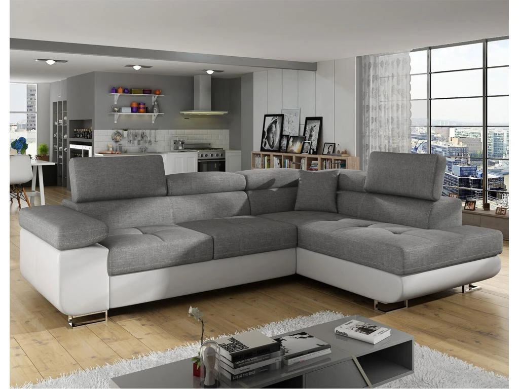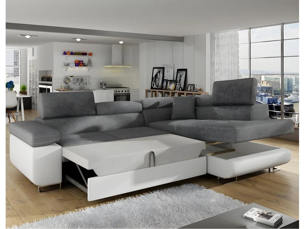 Ce grand canapé d’angle convertible s’adaptera à toutes les décorations sans aucune fausse note. La partie couchage peut être avec une housse blanche, beige, grise ou noir.