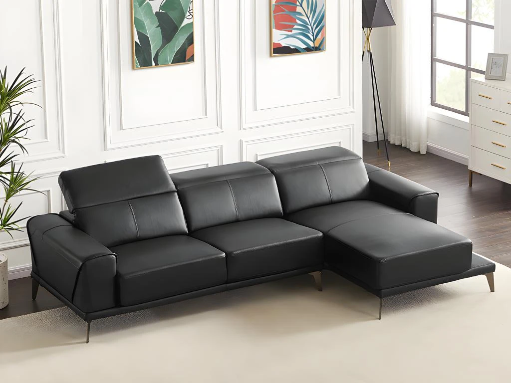 Le canapé d’angle ANDOR saura vous plaire grâce à ses nombreux atouts. Il vous procurera un confort certain puisqu’il dispose de 3 têtières relax que vous pouvez positionner de 6 manières différentes. Doté d’un revêtement en cuir de buffle, il apportera une touche d’élégance dans votre salon.