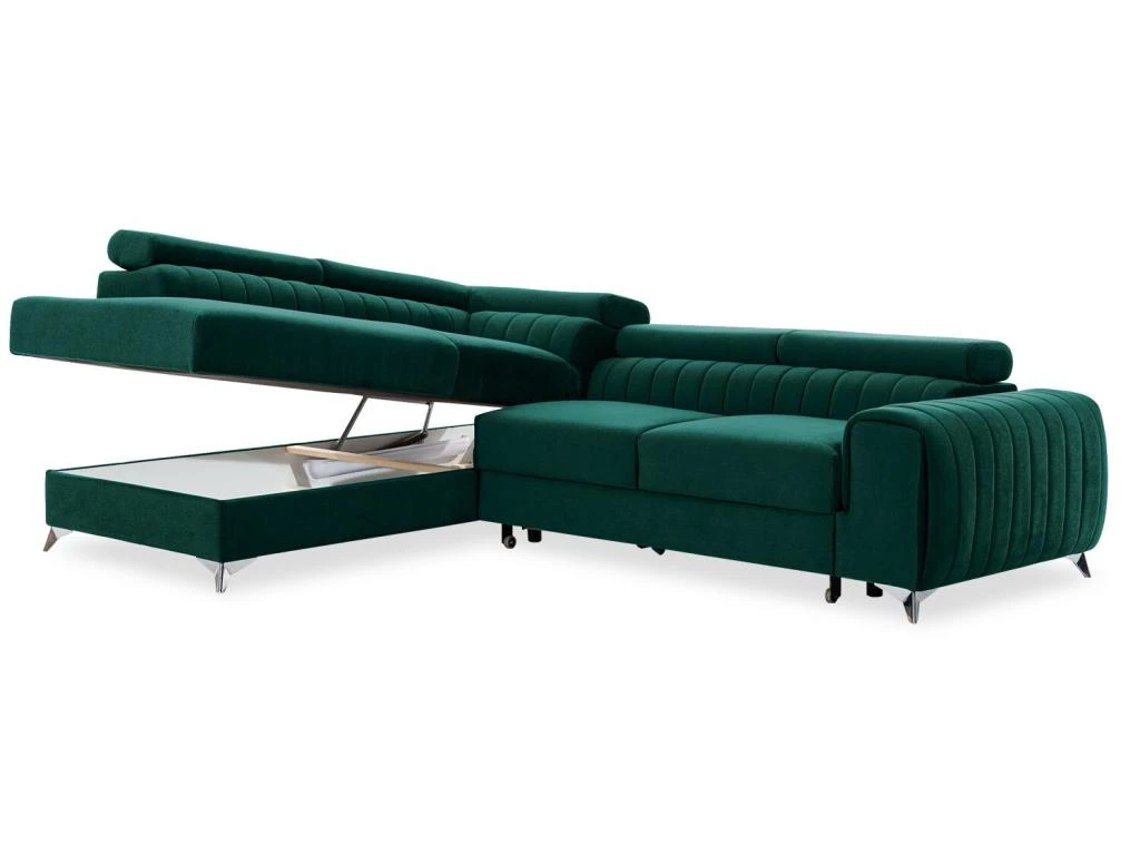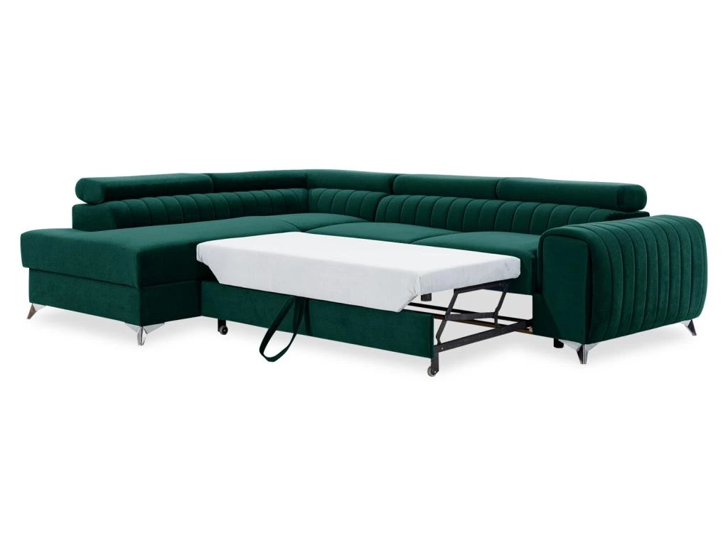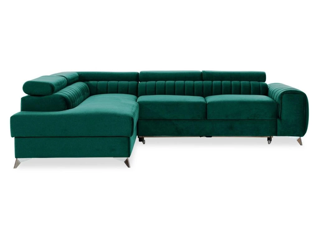 Ce grand canapé d’angle gauche en velours vert aux courbes contemporaines est l’allié parfait pour vous relaxer. Détendez vous et profitez de la douceur du velours!