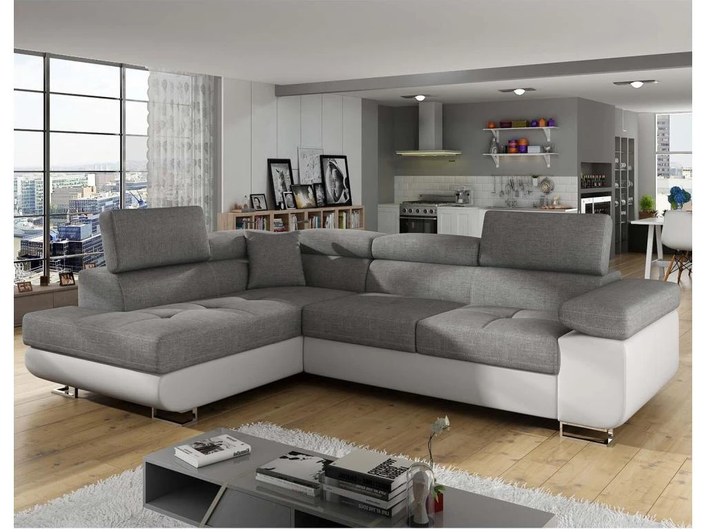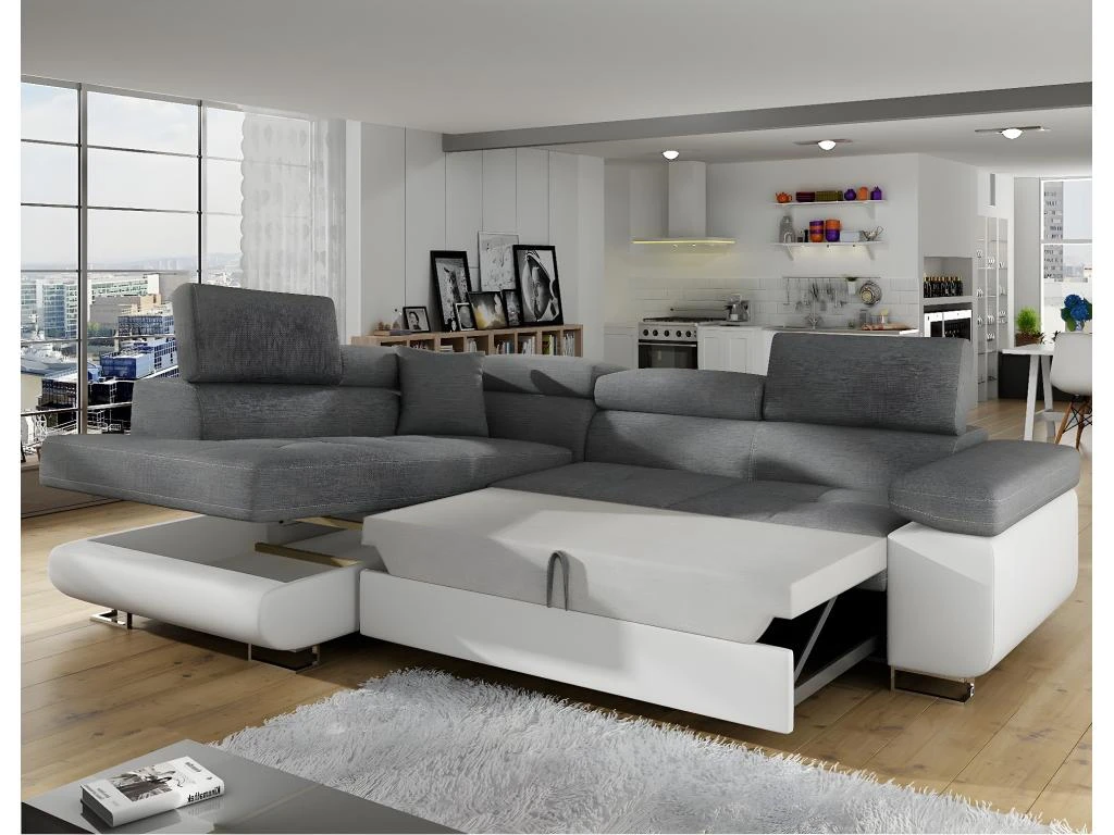 Ce grand canapé d’angle convertible s’adaptera à toutes les décorations sans aucune fausse note. La partie couchage peut être avec une housse blanche, beige, grise ou noir.