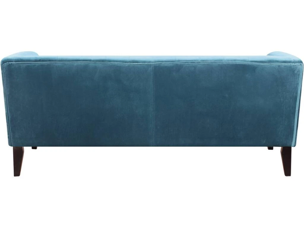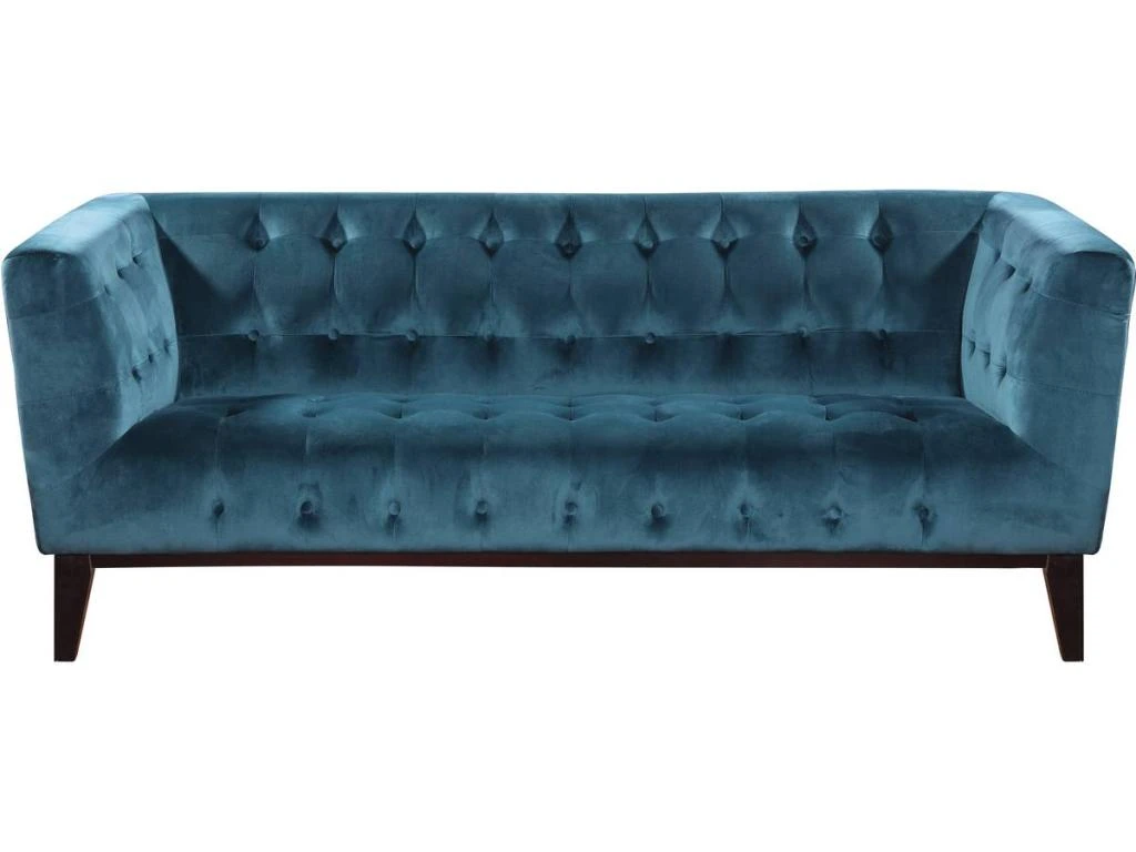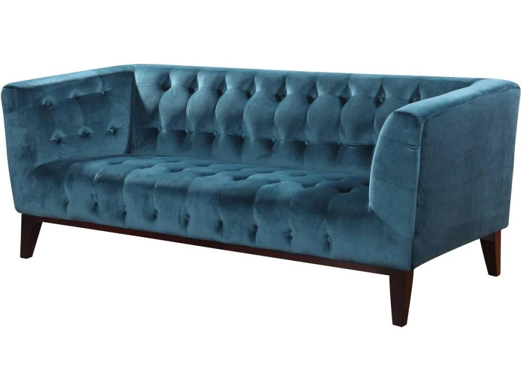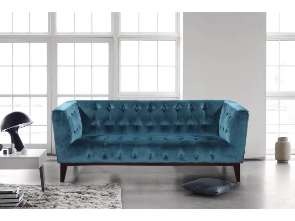 Descriptif : Canapé fixe velours Vanessa – bleu canard – en polyester – structure en bois – dimensions: 189 x 82 x 75.5 cm.