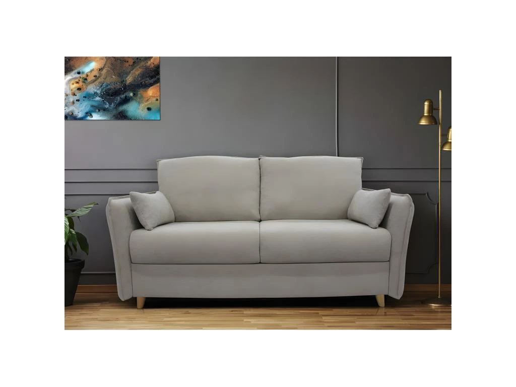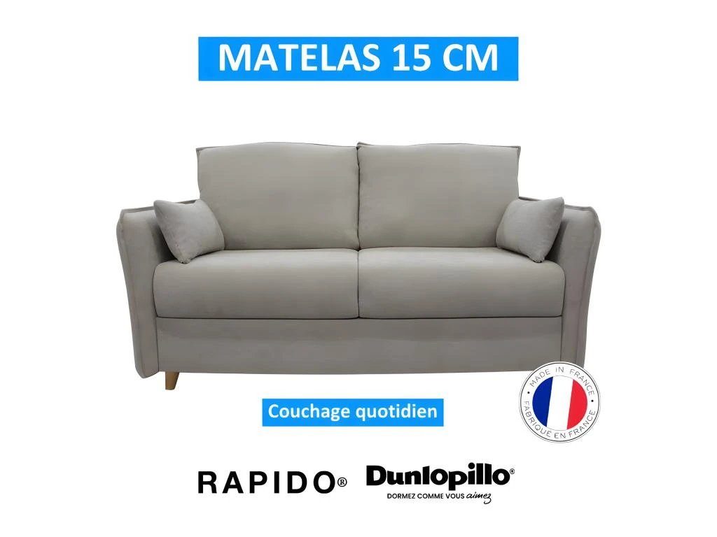 Craquez pour la sobriété d’un canapé convertible 3 places, 100% fabriqué en France ! Son look charme et chaleureux trouvera sa place dans votre salon à coup sûr. Son joli revêtement en polyester apportera de la luminosité et de la douceur. Enfin, son piétement en bois teinte naturelle lui confère une touche scandinave tendance. Avec son assise et son dossier garnis en mousse haute résilience, vous profiterez d’instants de détente. Basculez aisément Ce canapé en mode lit grâce à son système révolutionnaire Rapido® Alpha et vivez des nuits reposantes grâce à son matelas DUNLOPILLO de 15 cm d’épaisseur.