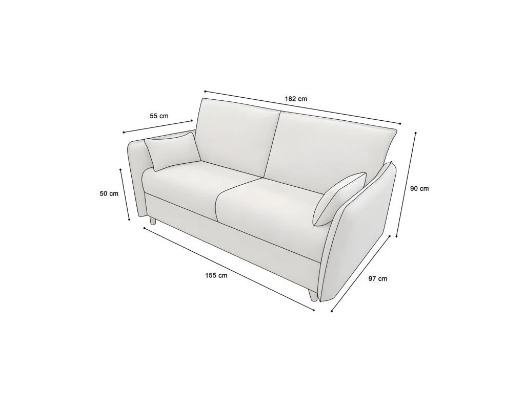 Dimensions canapé : L182xl97xH90cm – Dimensions assise : L155xP55xH50cm – Dimensions couchage : 140x195cm