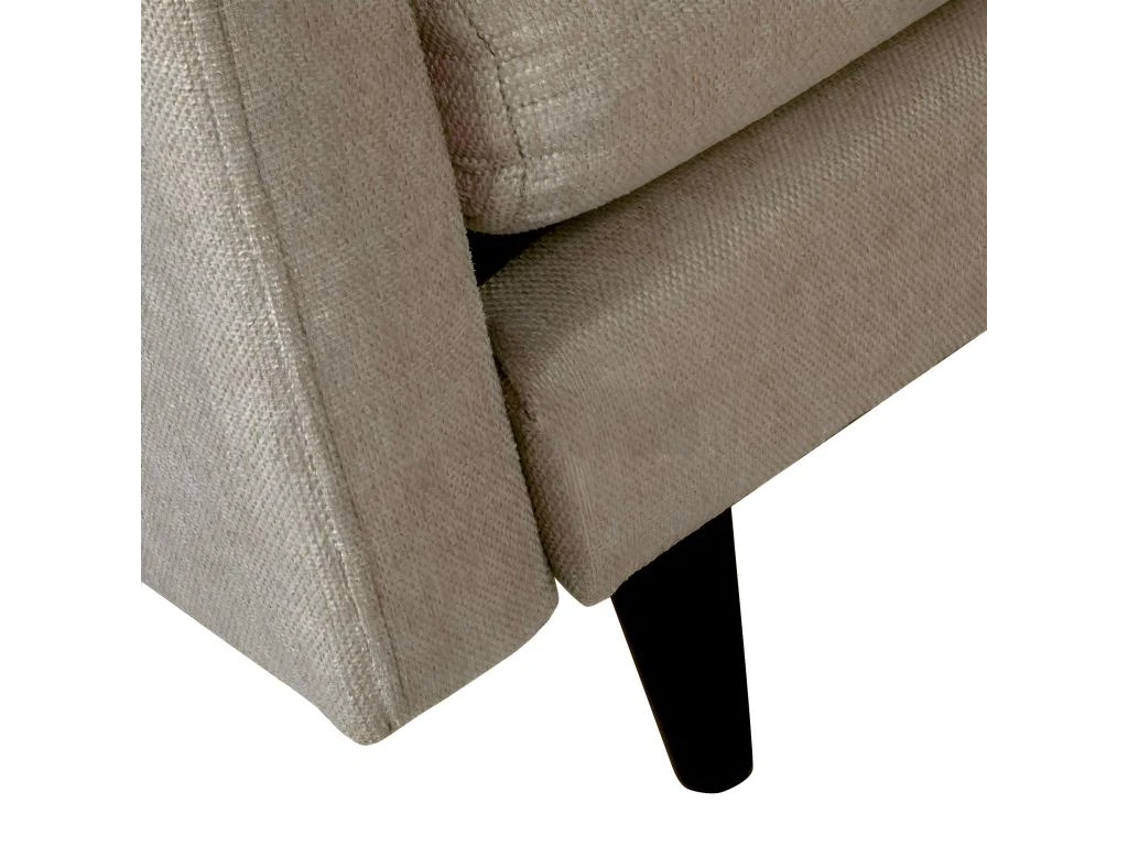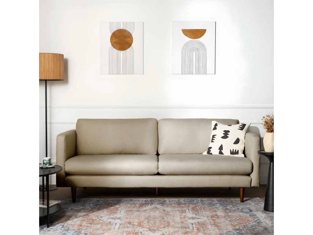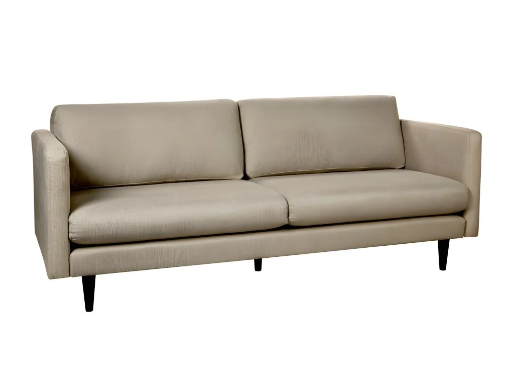 Des lignes droites, 2 coussins moelleux et un tissu ultra doux rehaussé par des pieds en bois foncé : c’est la recette (qui fonctionne toujours) de Romie.